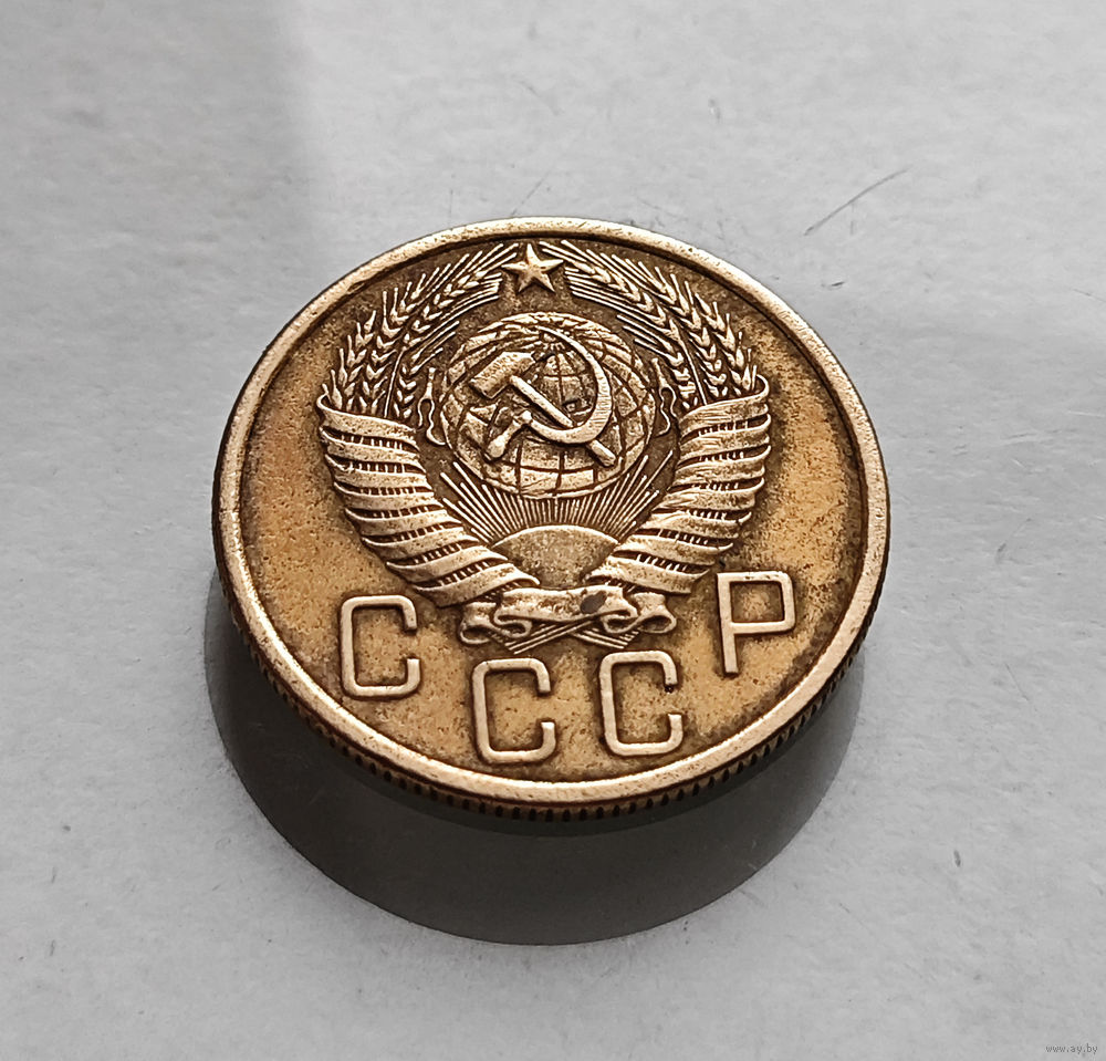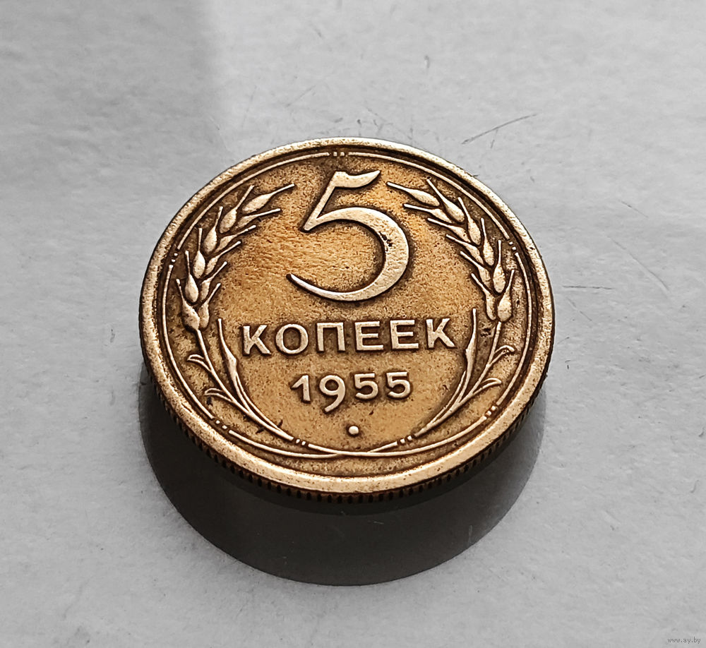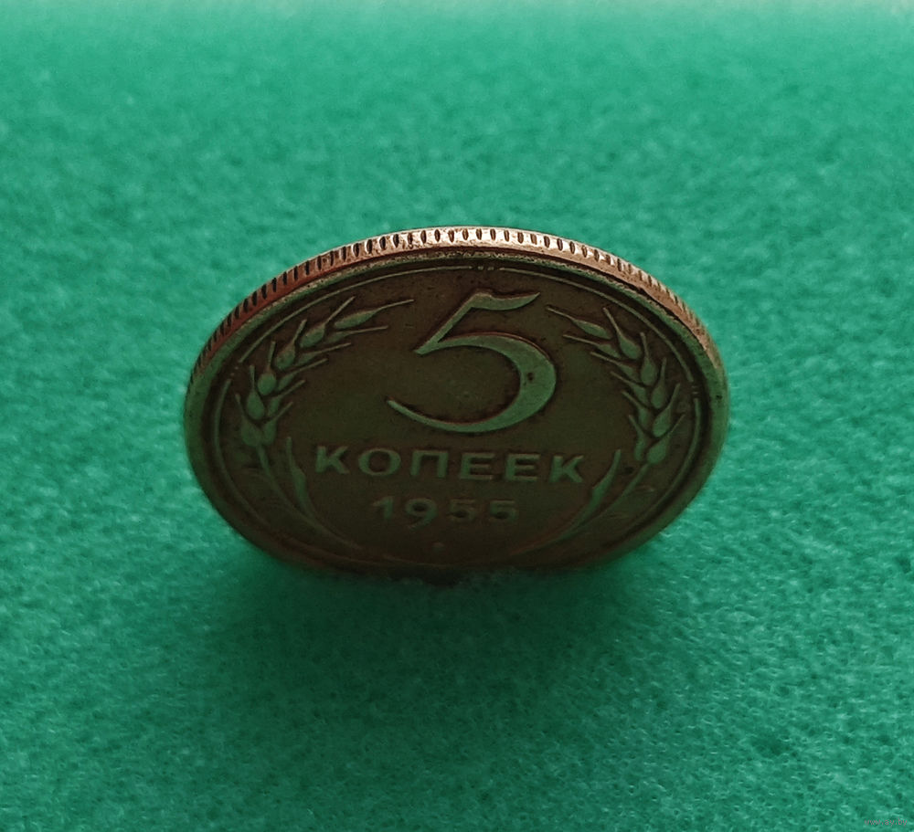 Перед нами монета 5 копеек, выпущенная в 1955 году, в 1955 году введена в обращение.