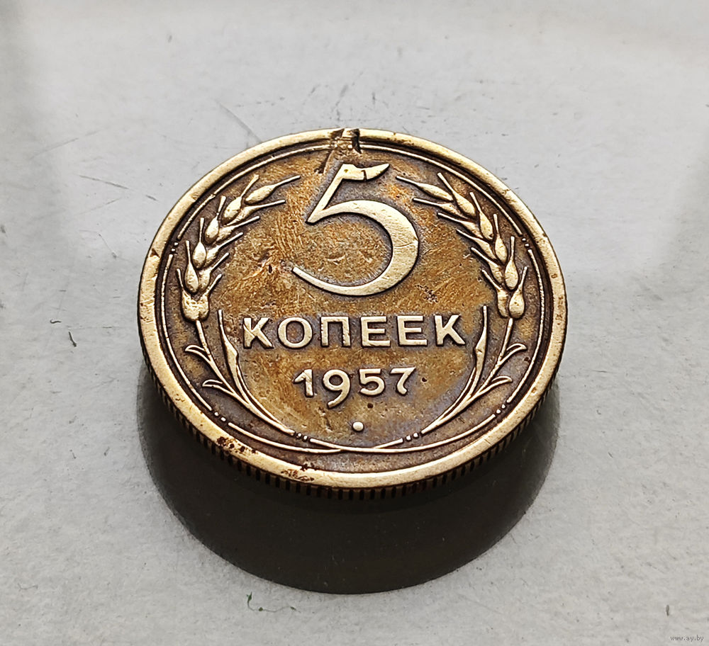 Перед нами монета 5 копеек, выпущенная в 1957 году, в 1957 году введена в обращение.