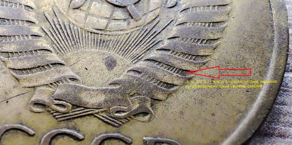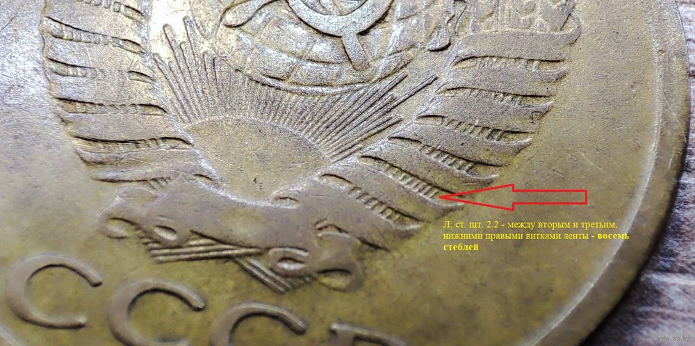 - Л. ст. шт. 1.1 (для 50 коп 1961) - буква «Р» не отставлена вправо (фото №5), под связующим витком ленты срезы стеблей соединены линиями (фото №5), звезда большего размера (фото №6). Об. ст. шт. Б - под единицами даты, между листьями венка, есть линии (фото №3-4) - 1шт