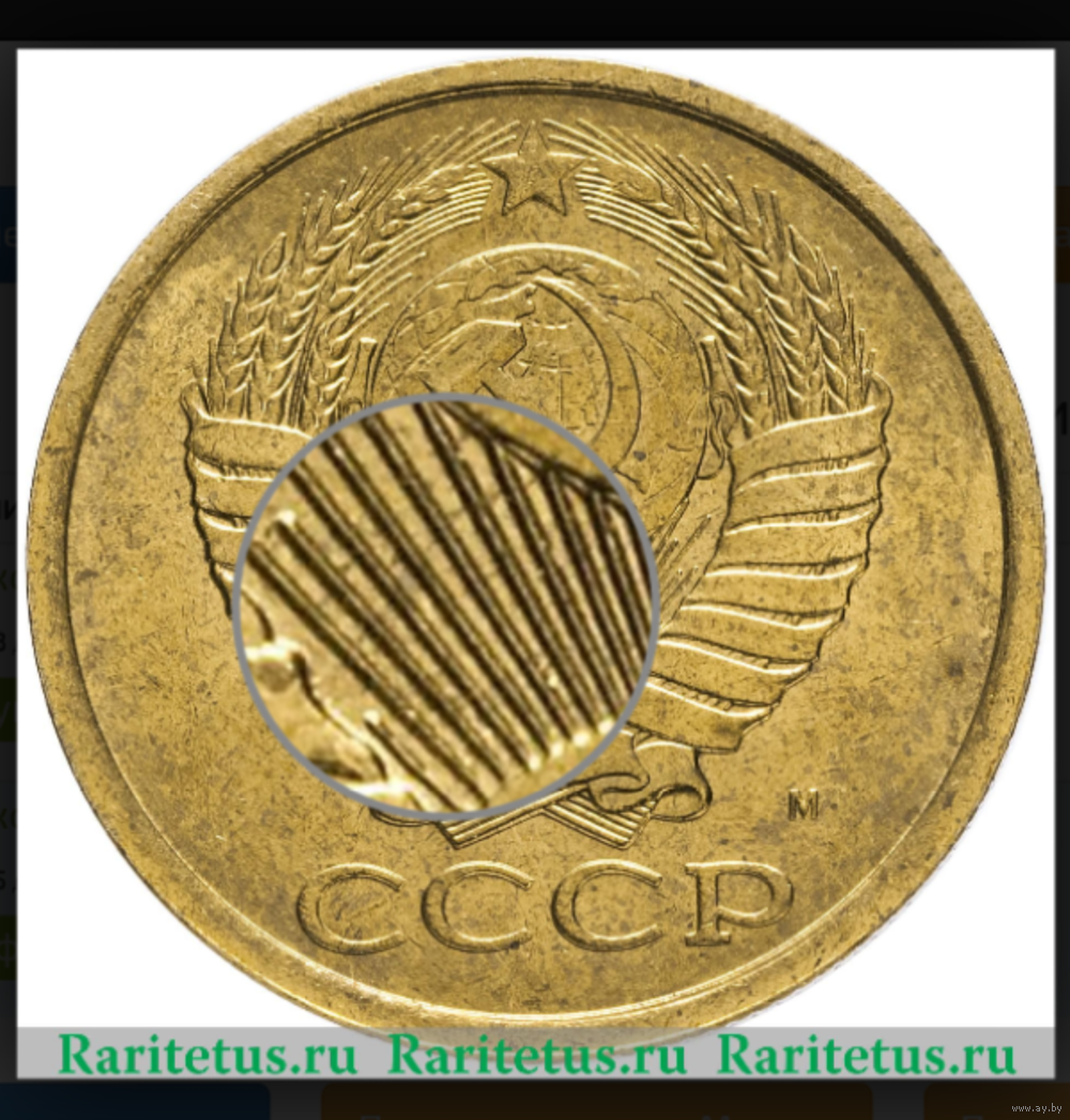 5 копеек 1991 г.. aUnc. Разновидность. Особенность чеканки, - в лучах, слева, отчеканена линия, пересекающая лучи. Тоньше других аналогов 1991 г. (см. на фото гурт слева). 3 шт..