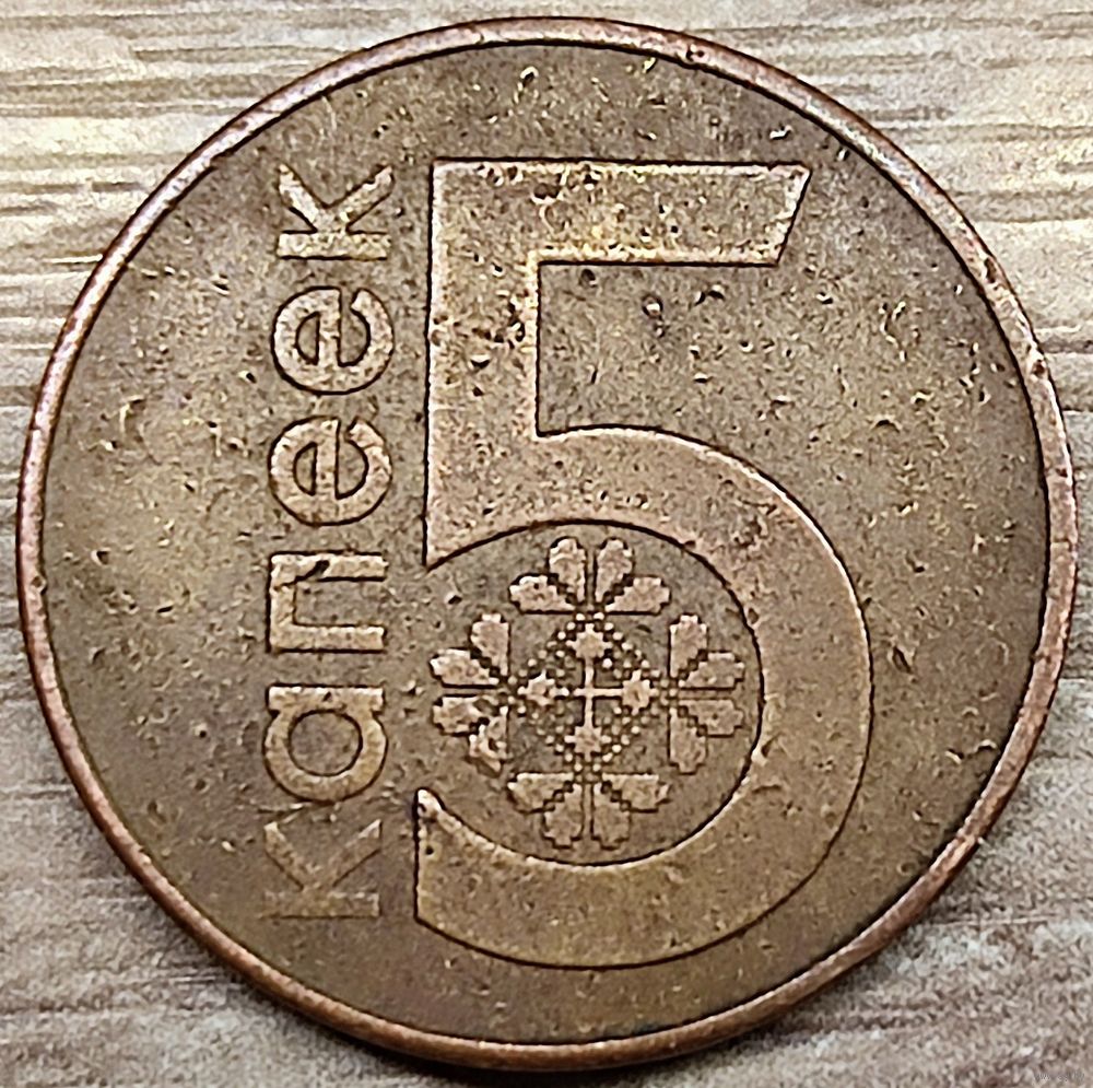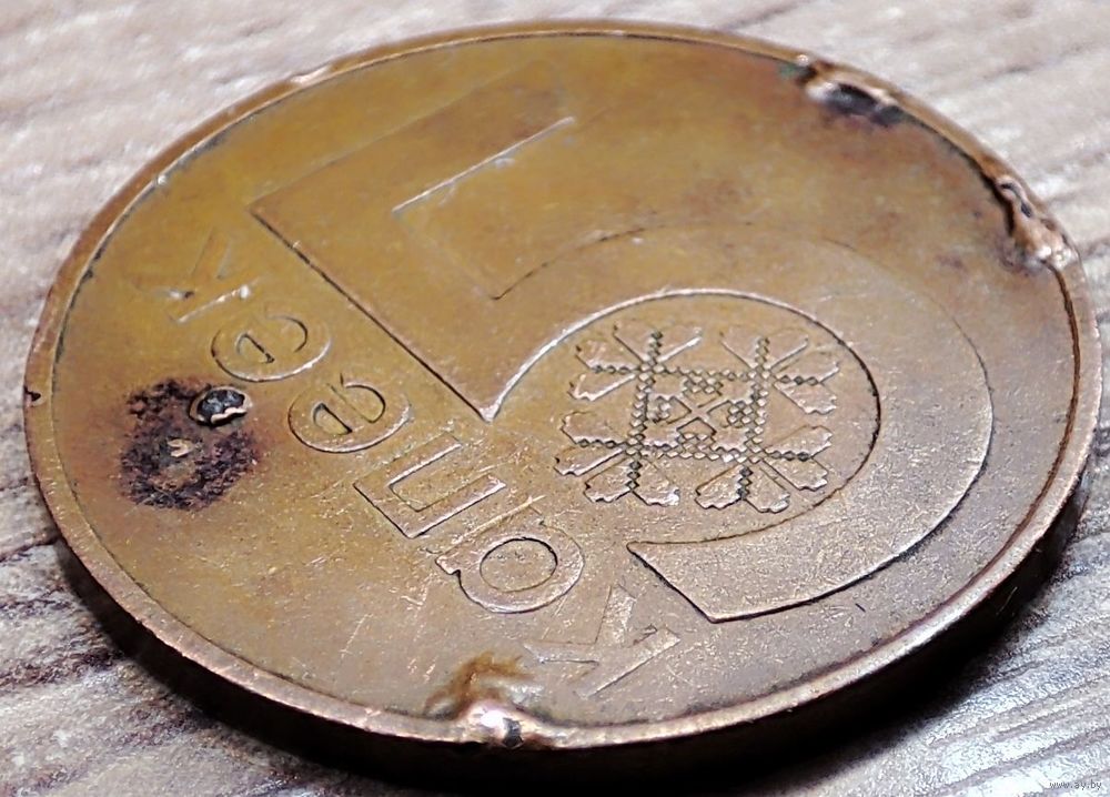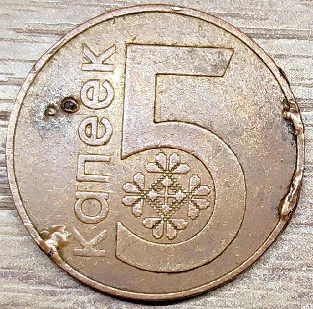 Описание реверса: В центре стилизованная надпись на белорусском языке: «5 КАПЕЕК» - 5 копеек. Справа от неё традиционный узор
