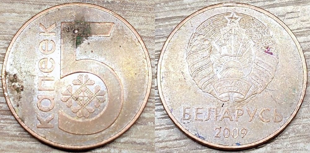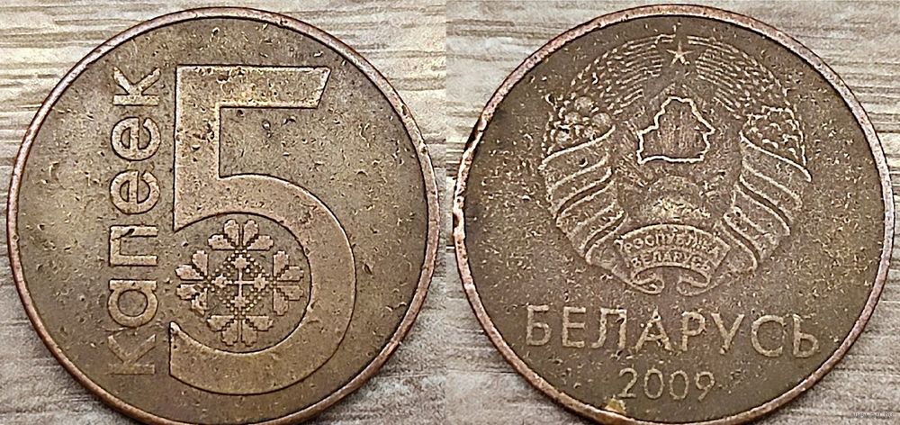Описание реверса: В центре стилизованная надпись на белорусском языке: «5 КАПЕЕК» - 5 копеек. Справа от неё традиционный узор