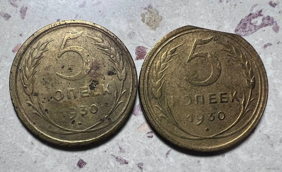 Лот состоит из двух монет 5 копеек 1930 года. Непрочекан на обеих, плюс край листа. Возможен обмен.