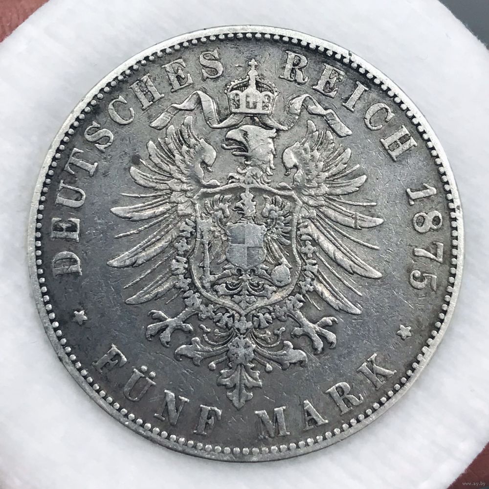 5 марок 1875 Баден нечастая! Крупное серебро Германской империи