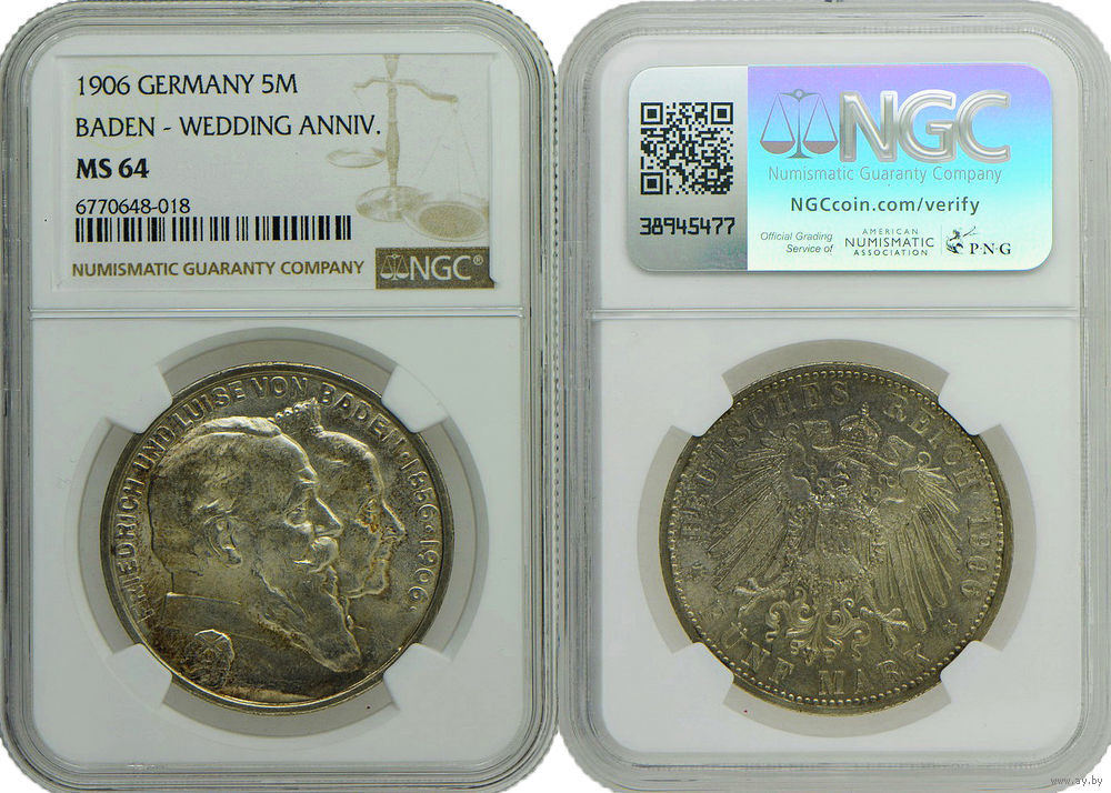 5 марок 1906 г. Баден. Германия. NGC MS 64. 50 лет свадьбе Фридриха I и Луизы Прусской. Серебро. Редкая монета в превосходном коллекционном состоянии. Монета в слабе NGC, сохранность MS 64. Краузе #277.