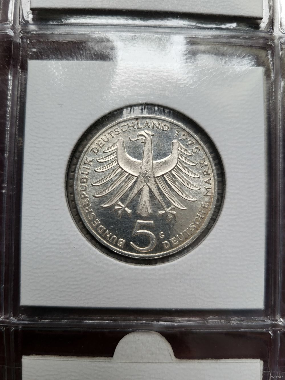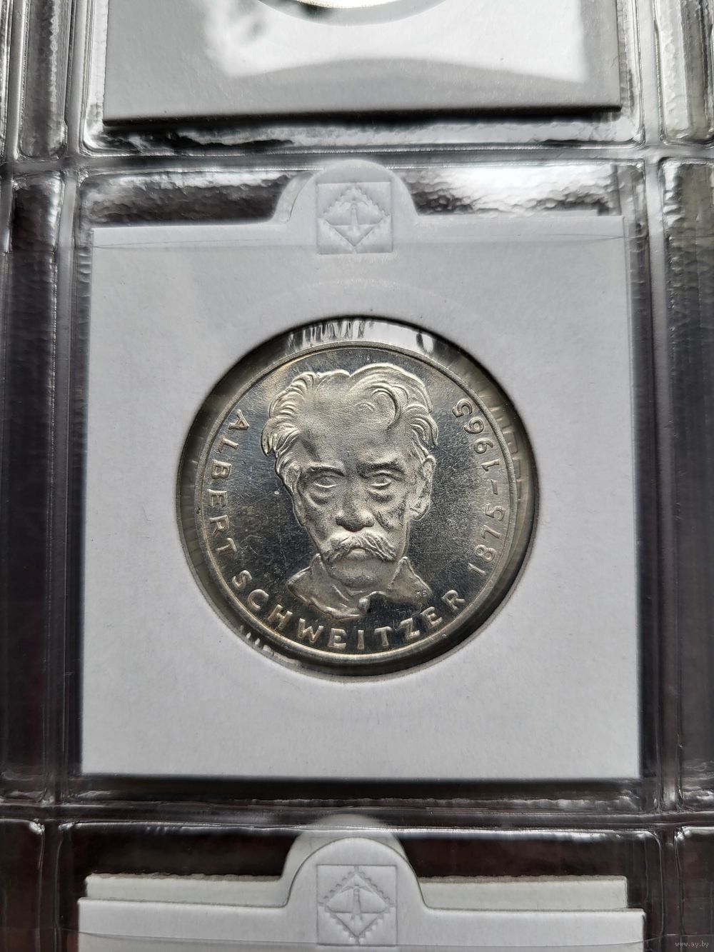 5 марок 1975 G Альберт Швейцер! Штемпель! Серебро 11.2 грамма 625 пробы 0,225 унции! ВОЗМОЖЕН ОБМЕН!