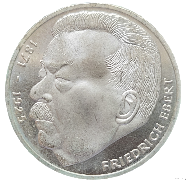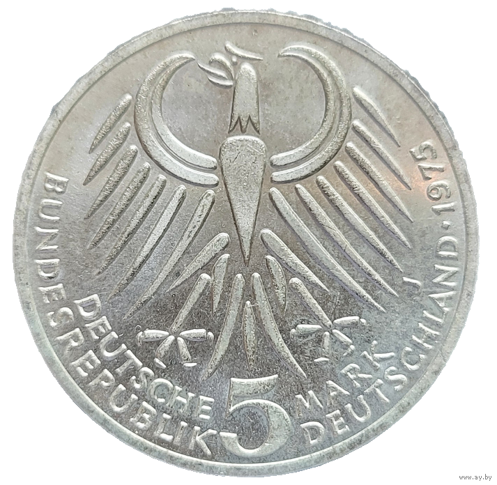 5 марок 1975 J Фридрих Эберт! Штемпель! Серебро 11.2 грамма 625 пробы 0,225 унции! ВОЗМОЖЕН ОБМЕН!
