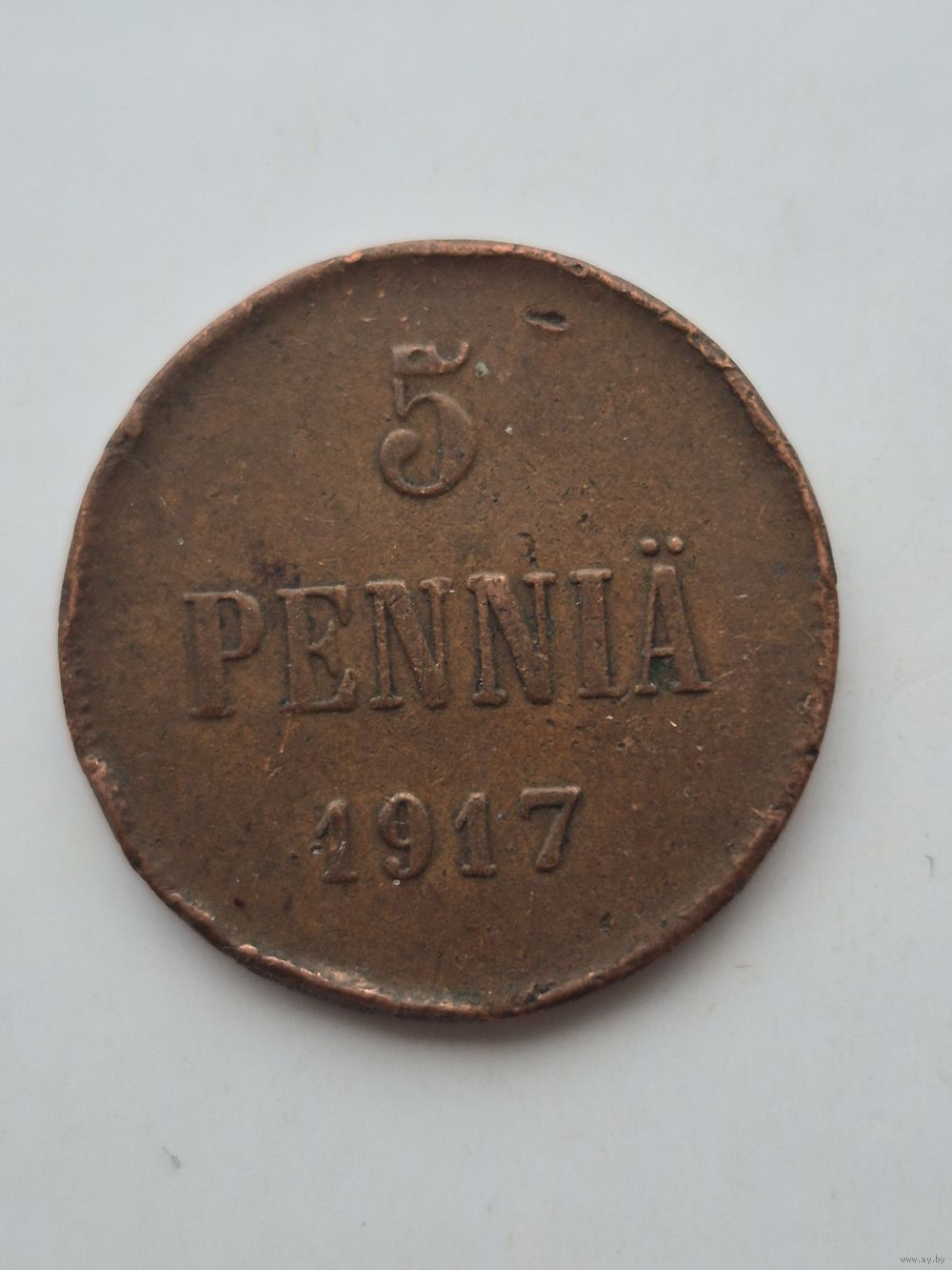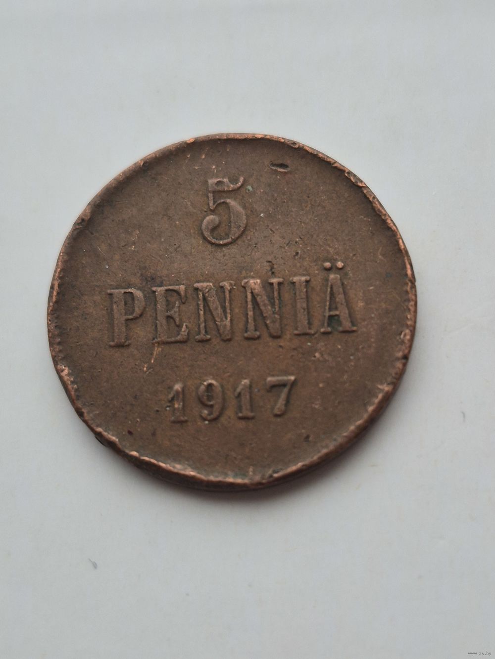 5 пенни 1917 года для Финляндии (Николай II). Монета не чищена. 45384