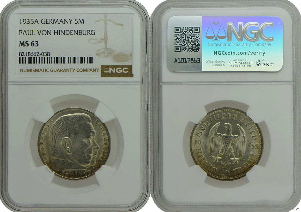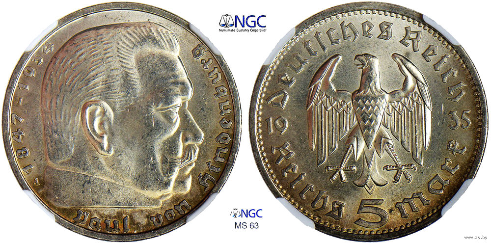 5 рейхсмарок 1935 г. А. ГИНДЕНБУРГ, ПАУЛЬ (Hindenburg, Paul von) (1847–1934), президент Веймарской республики. Германия. Серебро. Отличное коллекционное состояние. Монета в слабе NGC, сохранность MS 63. Краузе #86.