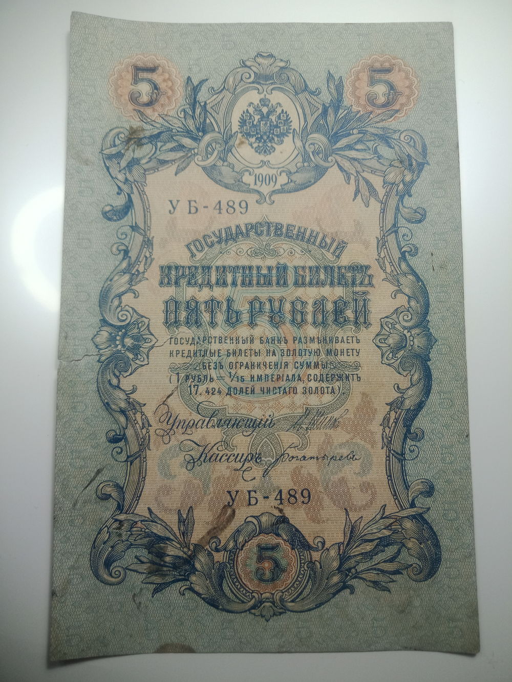 5 рублей 1909 года , Щипов - Богатырев , УБ - 489