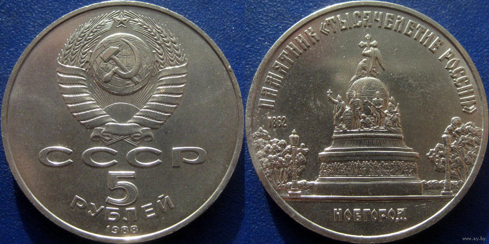 5 рублей 1988 года. Новгород. Памятник Тысячелетие России. UNC.