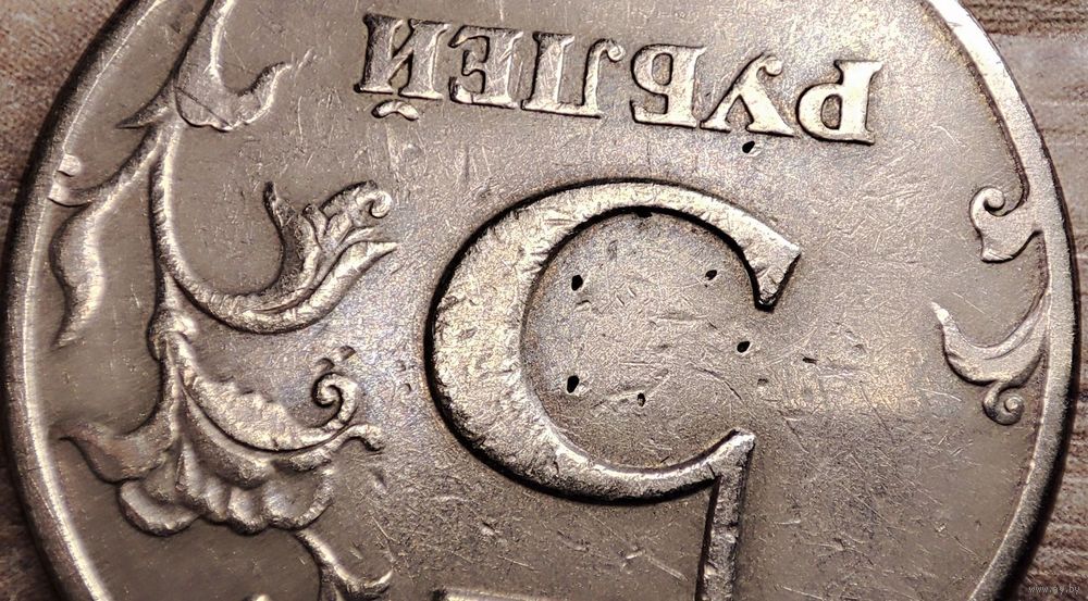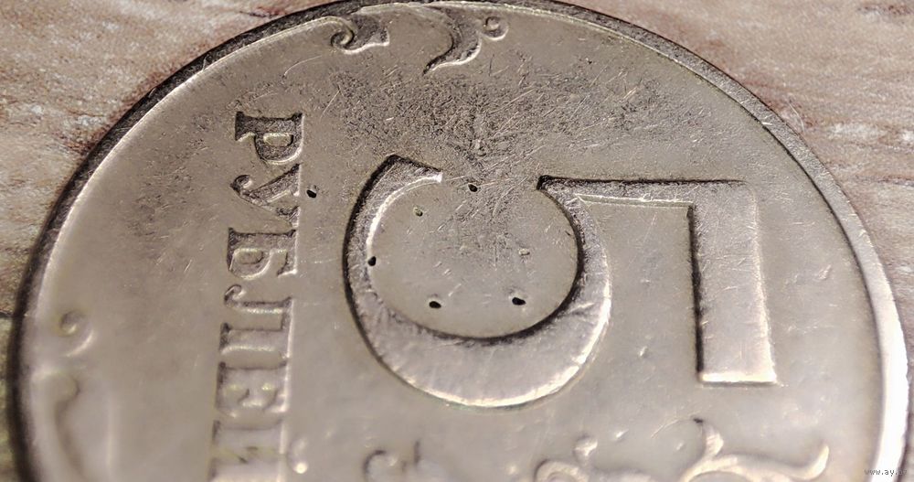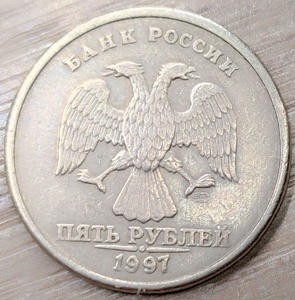 Монета номиналом 5 рублей 1997 СПМД в количестве - 1шт (немагнитная). Уникальный засор штемпеля реверса, также можно наблюдать асимметрию канта обеих сторон
