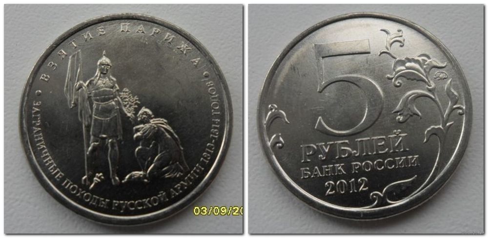 5 рублей Россия 2012 года - взятие Парижа, ОВ 1812 года