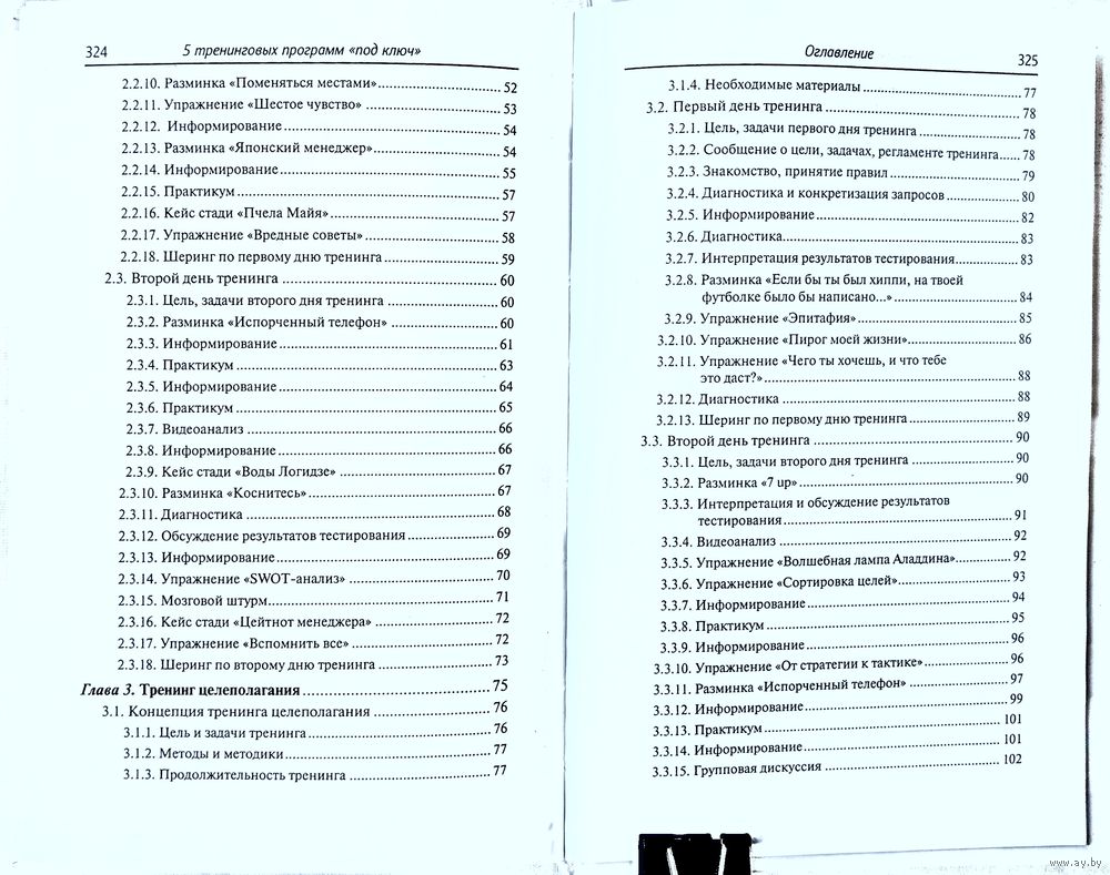 Программа каждого тренинга включает в себя описание его концепции, упражнений, возможных проблемных ситуаций и способы их разрешения. В книге описана специфика методов тренинга: кейс стади, ролевой игры, групповой дискуссии, разминок, даны алгоритмы их использования и разработки.