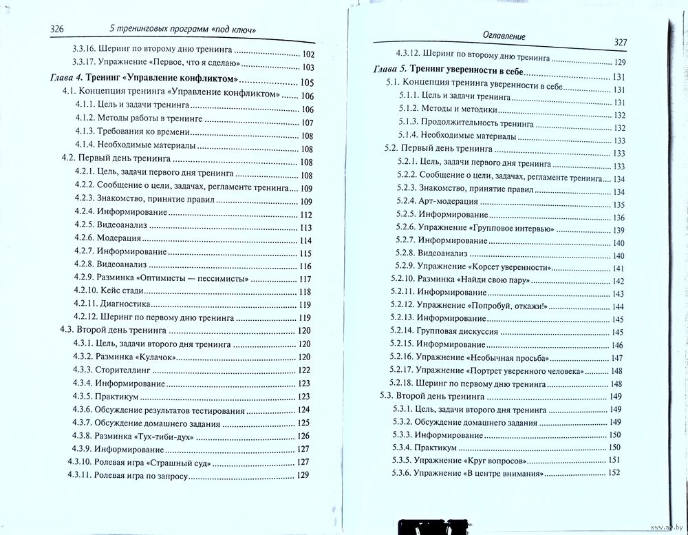 Программа каждого тренинга включает в себя описание его концепции, упражнений, возможных проблемных ситуаций и способы их разрешения. В книге описана специфика методов тренинга: кейс стади, ролевой игры, групповой дискуссии, разминок, даны алгоритмы их использования и разработки.