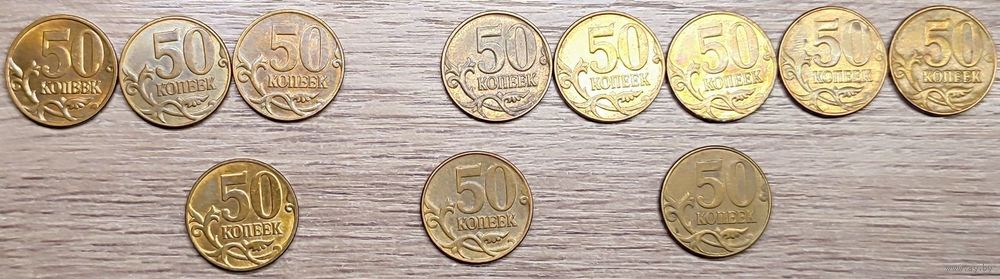 Описание реверса: в середине сдвинутая вправо и вверх цифра «50», обозначающая достоинство монеты, ниже надпись «КОПЕЕК». Внизу, слева и справа завитки растительного орнамента