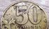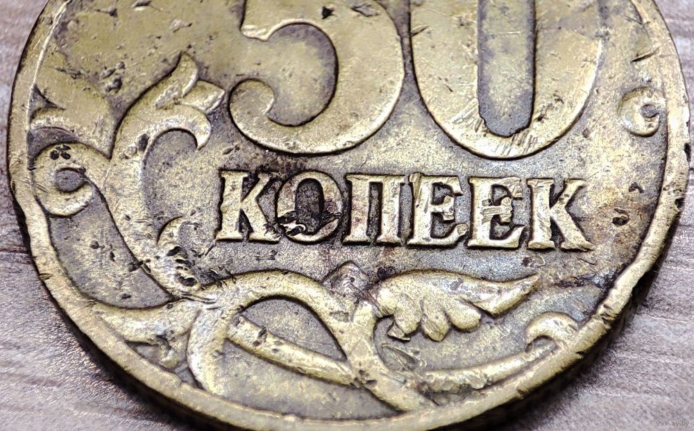 Описание реверса: в середине сдвинутая вправо и вверх цифра «50», обозначающая достоинство монеты, ниже надпись «КОПЕЕК». Внизу, слева и справа завитки растительного орнамента