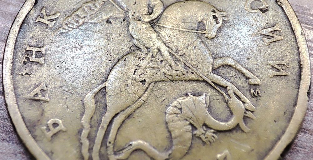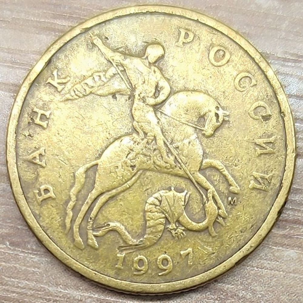 Описание аверса: Слева вдоль выступающего канта слово «БАНК», справа «РОССИИ», внизу год выпуска «1997», в центре Георгий Победоносец колющий копьем змея, под передней ногой коня буквенное обозначение монетного двора «М» (ММД)