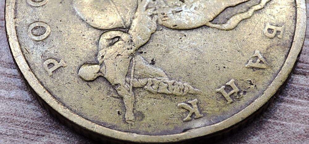 Монета номиналом 50 копеек 1997 М в количестве - 1шт (немагнитная). С обильным засором штемпеля аверса и реверса, также присутствуют следы от воздействия различных факторов окружающей среды