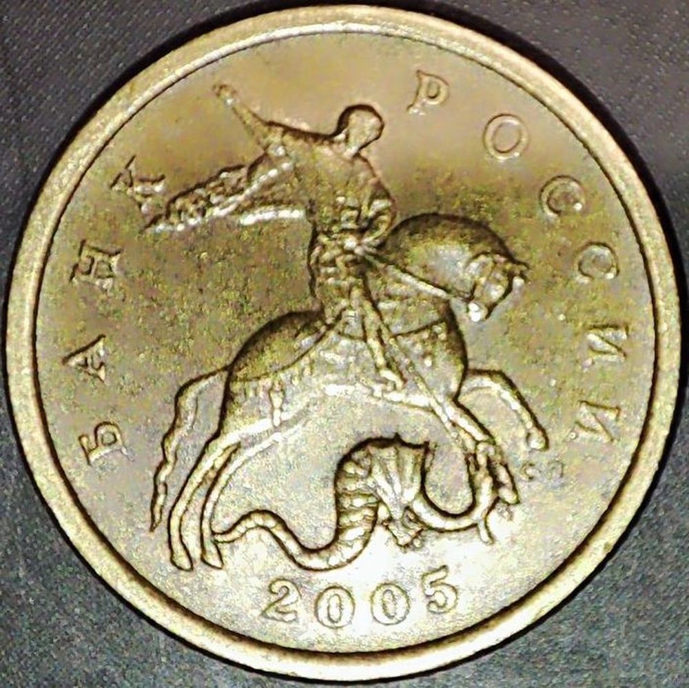 Описание аверса: слева вдоль выступающего канта слово «БАНК», справа «РОССИИ», внизу год выпуска «2005», в центре Георгий Победоносец колющий копьем змея, под передней ногой коня буквенное обозначение монетного двора «С-П» (СПМД)