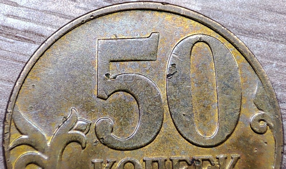 Монета номиналом 50 копеек 2008 М (магнитная) с обильным засором штемпеля реверса
