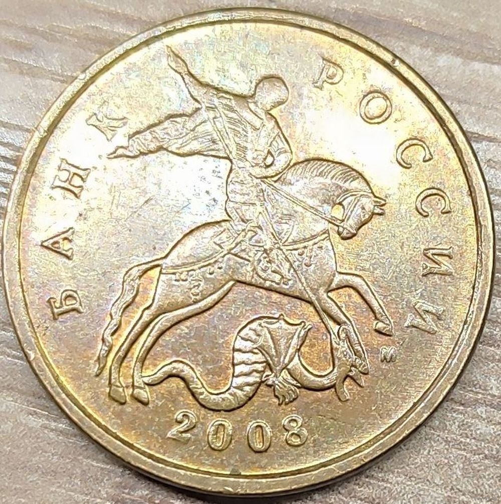 Описание аверса: Слева вдоль выступающего канта слово «БАНК», справа «РОССИИ», внизу год выпуска «2008», в центре Георгий Победоносец колющий копьем змея, под передней ногой коня буквенное обозначение монетного двора «М» (ММД)