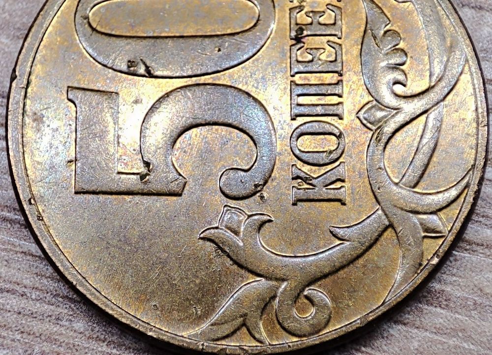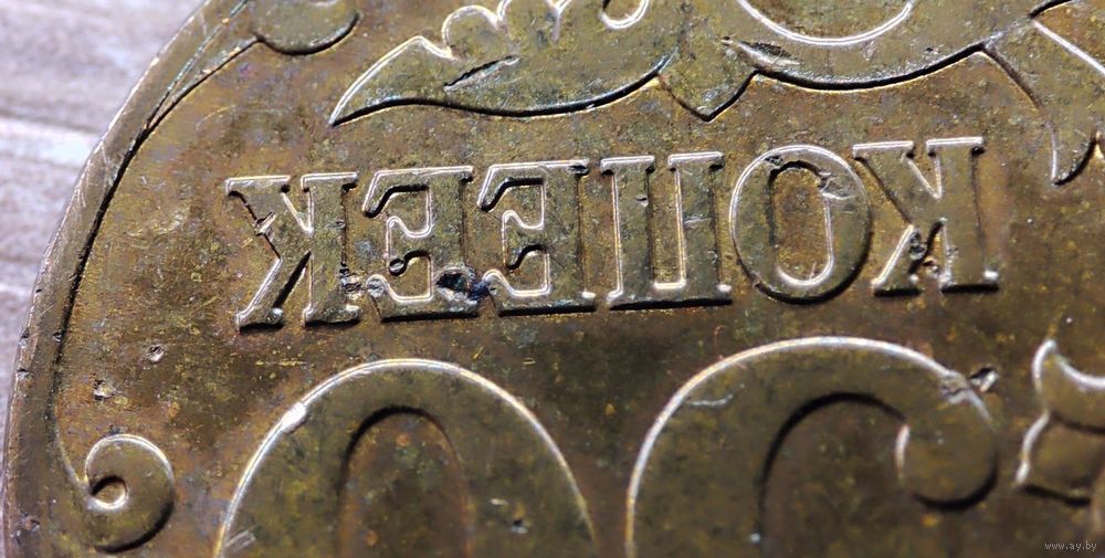 Описание реверса: в середине сдвинутая вправо и вверх цифра «50», обозначающая достоинство монеты, ниже надпись «КОПЕЕК». Внизу, слева и справа завитки растительного орнамента