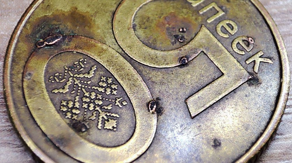 50 копеек 2009 год Республика Беларусь в количестве-1шт, магнитная. Полопавшиеся вздутия плакировки реверса
