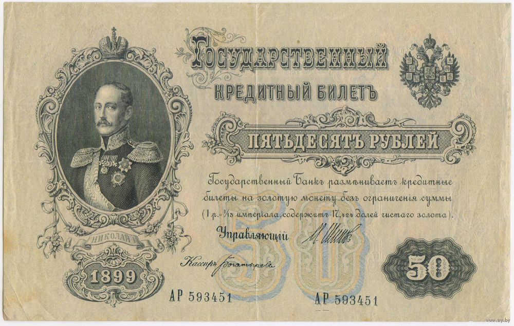 50 рублей 1899 год. Шипов Богатырев. АР 593451 Состояние XF-EF!!!