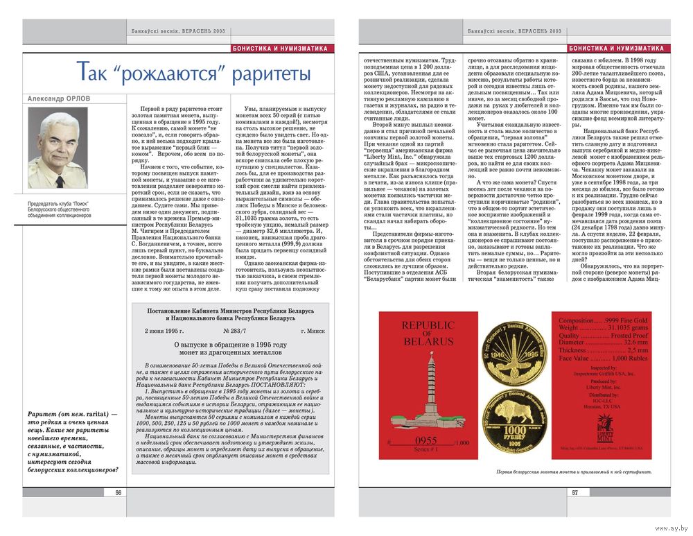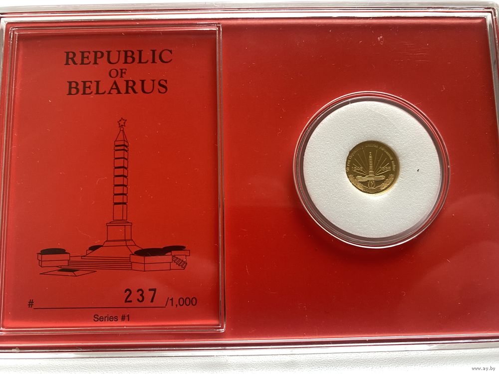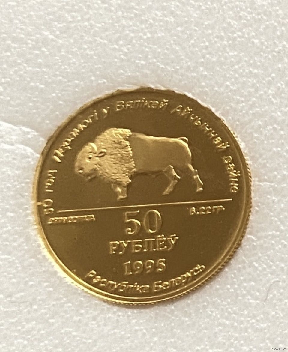 Первая золотая монета Республики Беларусь выпушенная в 1995 году в соответствии с Постановлением Кабинета Министров Республики Беларусь и Национального банка Республики Беларусь 2 июня 1995 г. № 283/7 г. Минск «О выпуске в обращение в 1995 году монет из драгоценных металлов».