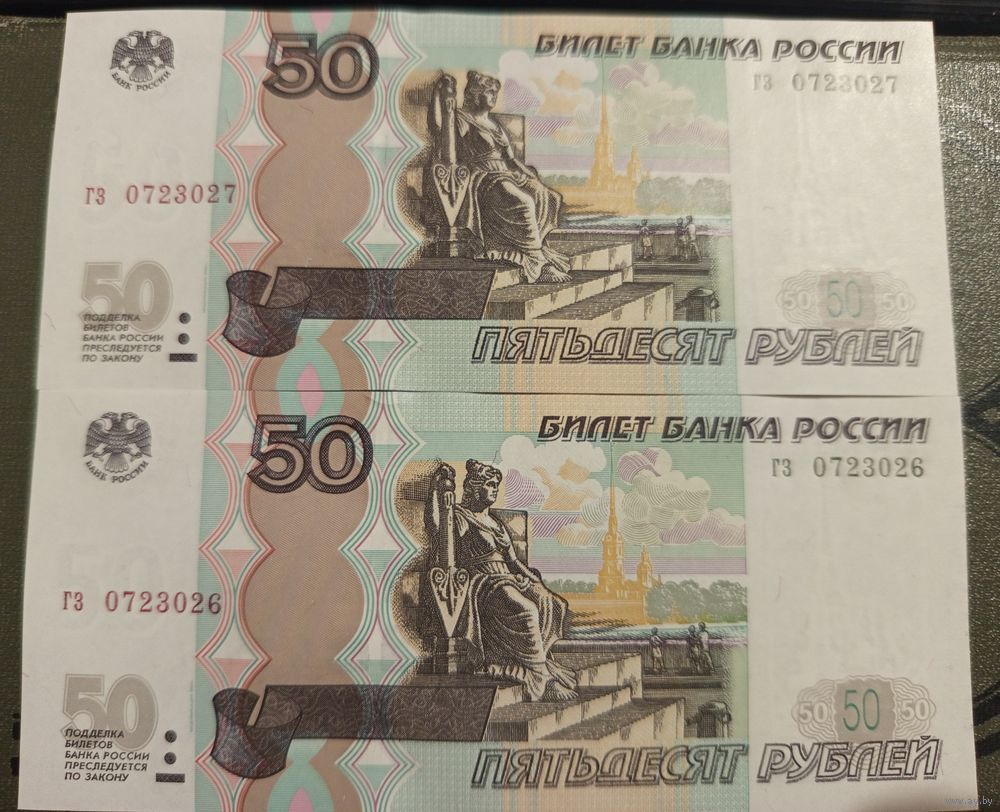 50 рублей Россия 1997 (2004) UNC, номера подряд гз 0723026-гз 07233027 (цена за все).