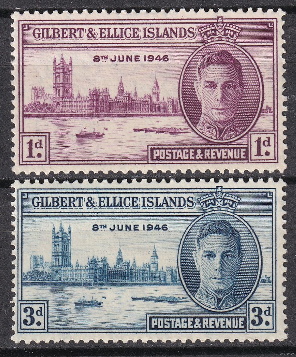 52.BrKS. Великобритания. Колонии. Острова Гилберта и Эллис. Георг VI. Победа во Второй Мировой Войне. Парламент. 1946 г. Полная серия. Mi.##50-51.