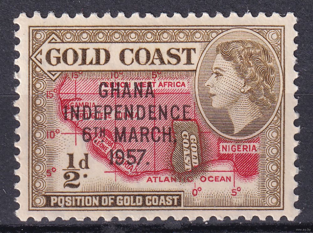58.BrK. Британский доминион Гана. Елизавета II. 1957 г. 1/2P. Надпечатка. Гана. Независимость. 6 марта 1957. MNH. Mi.#5.
