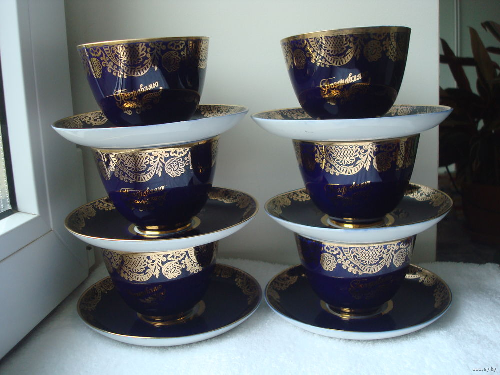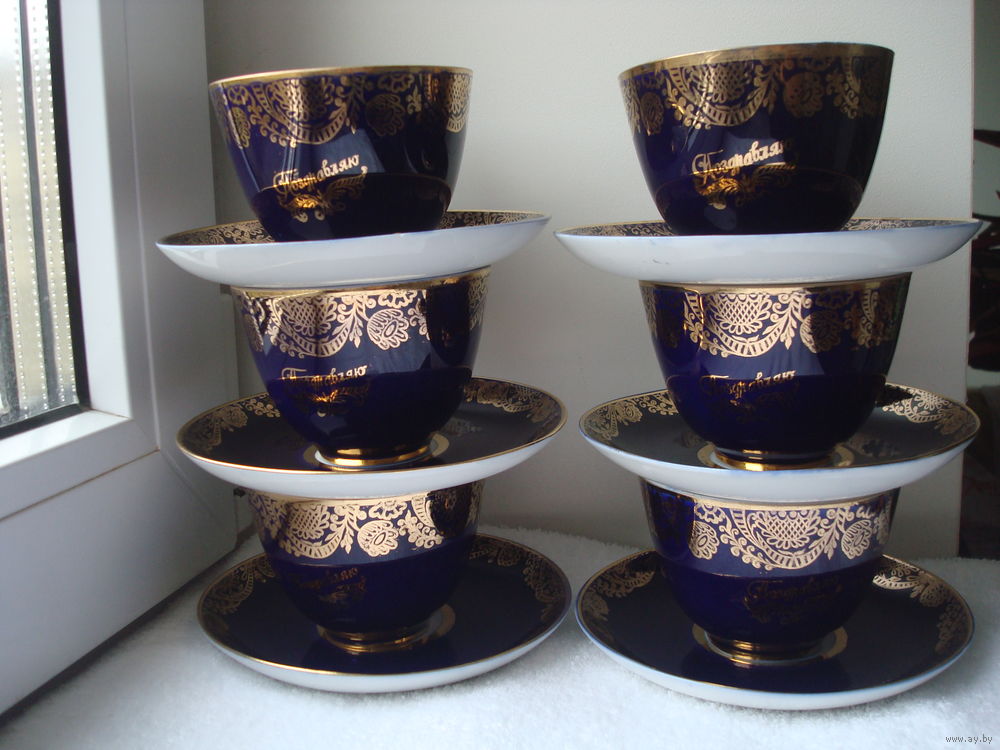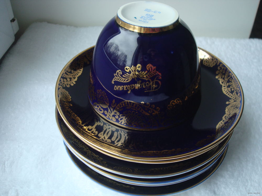 • 6 чайных кобальтовых пар "Версаль" с надписью золотом "Поздравляю" ЛФЗ  СССР в отличном состоянии. Витринное хранение. Вся позолота на месте.