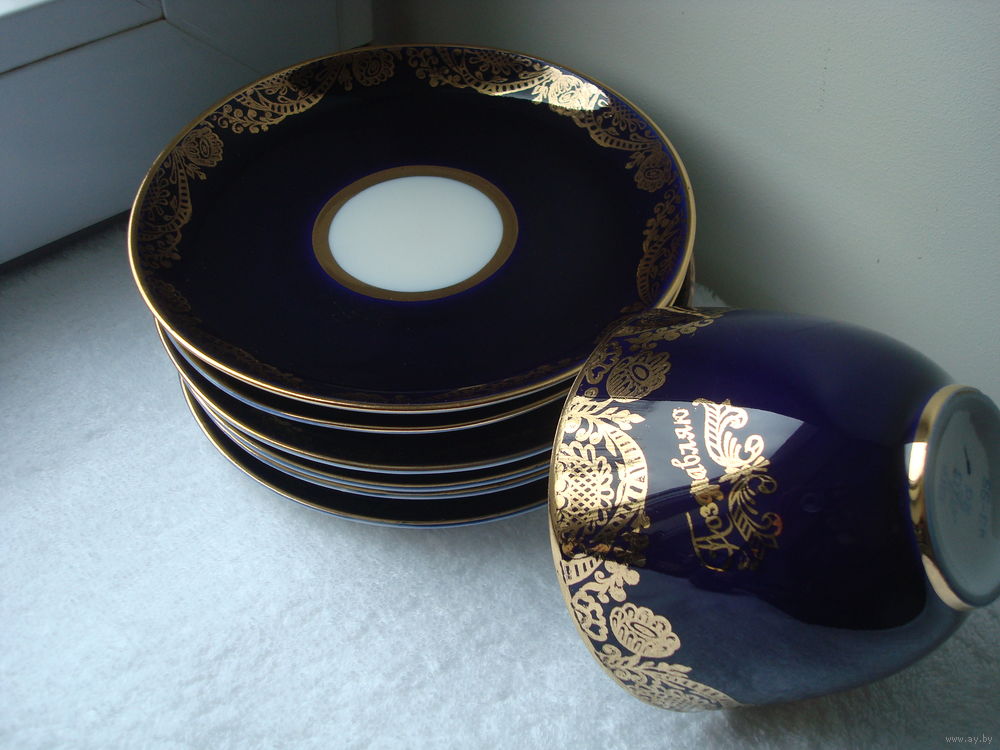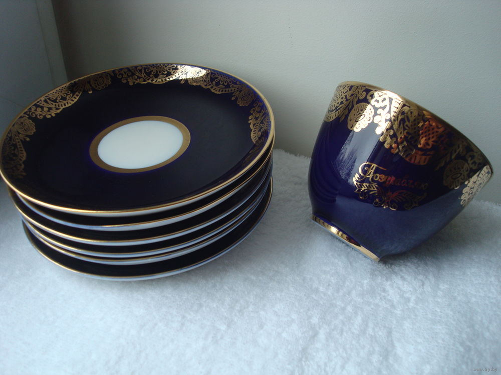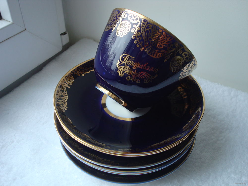 6 чайных пар с надписью золотом "Поздравляю" (чашка и блюдце) "Версаль" кобальт ЛФЗ СССР. Люкс.Продажа поштучно.
