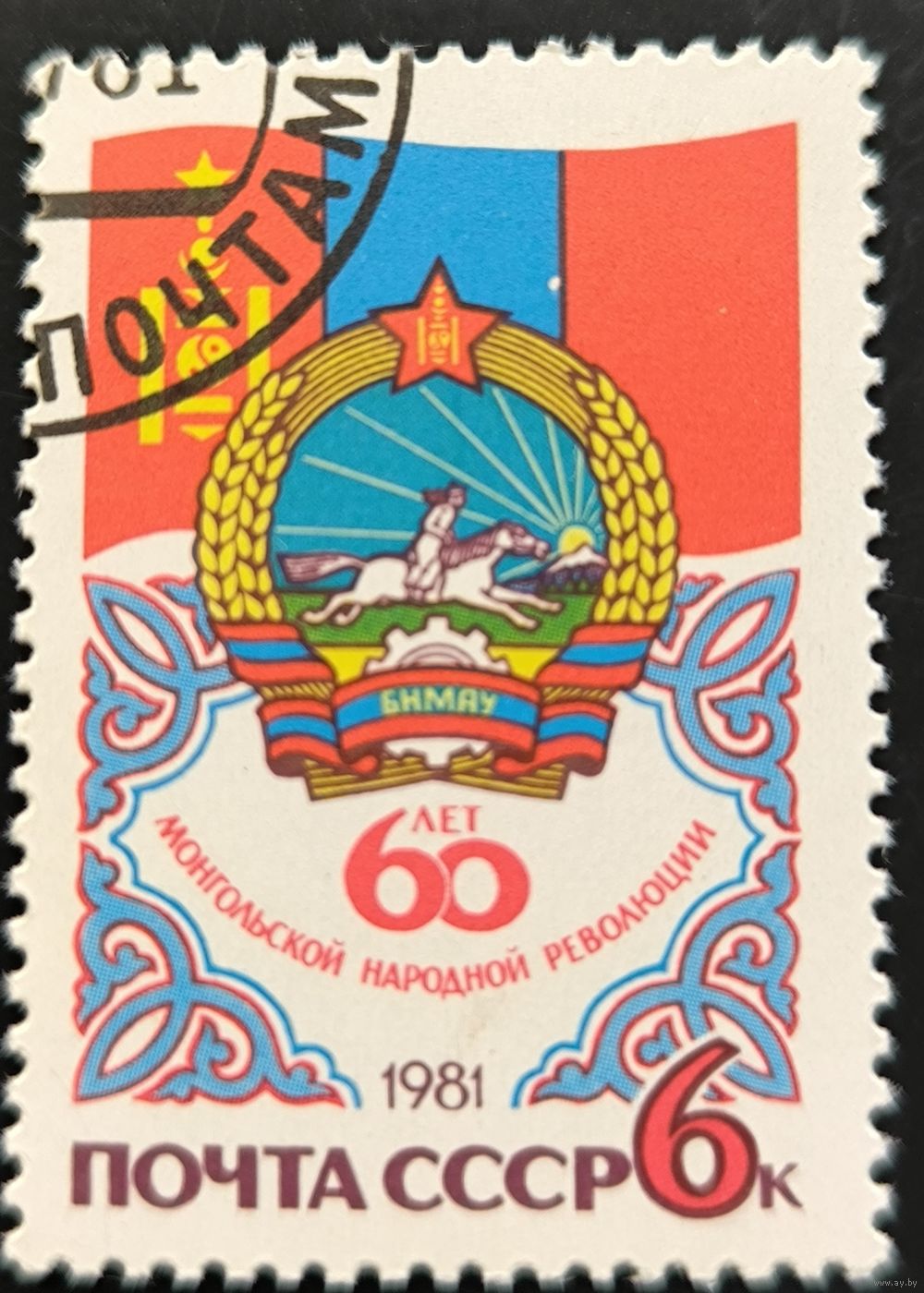 СССР. 60 лет монгольской народной революции (Заг № 5136). Дырка на флаге.