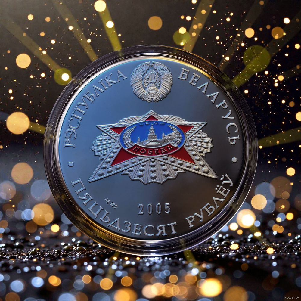 вверху – рельефное изображение Государственного герба Республики Беларусь; в центре – рельефное изображение ордена Победы (на серебряной – с эмалью красного и голубого цветов); под ним указаны: год чеканки, для серебряной – проба сплава; по кругу надписи: в верхней части – "РЭСПУБЛIКА БЕЛАРУСЬ", в нижней – "ПЯЦЬДЗЕСЯТ РУБЛЁЎ" на серебряной и "АДЗIН РУБЕЛЬ" – на медно–никелевой.