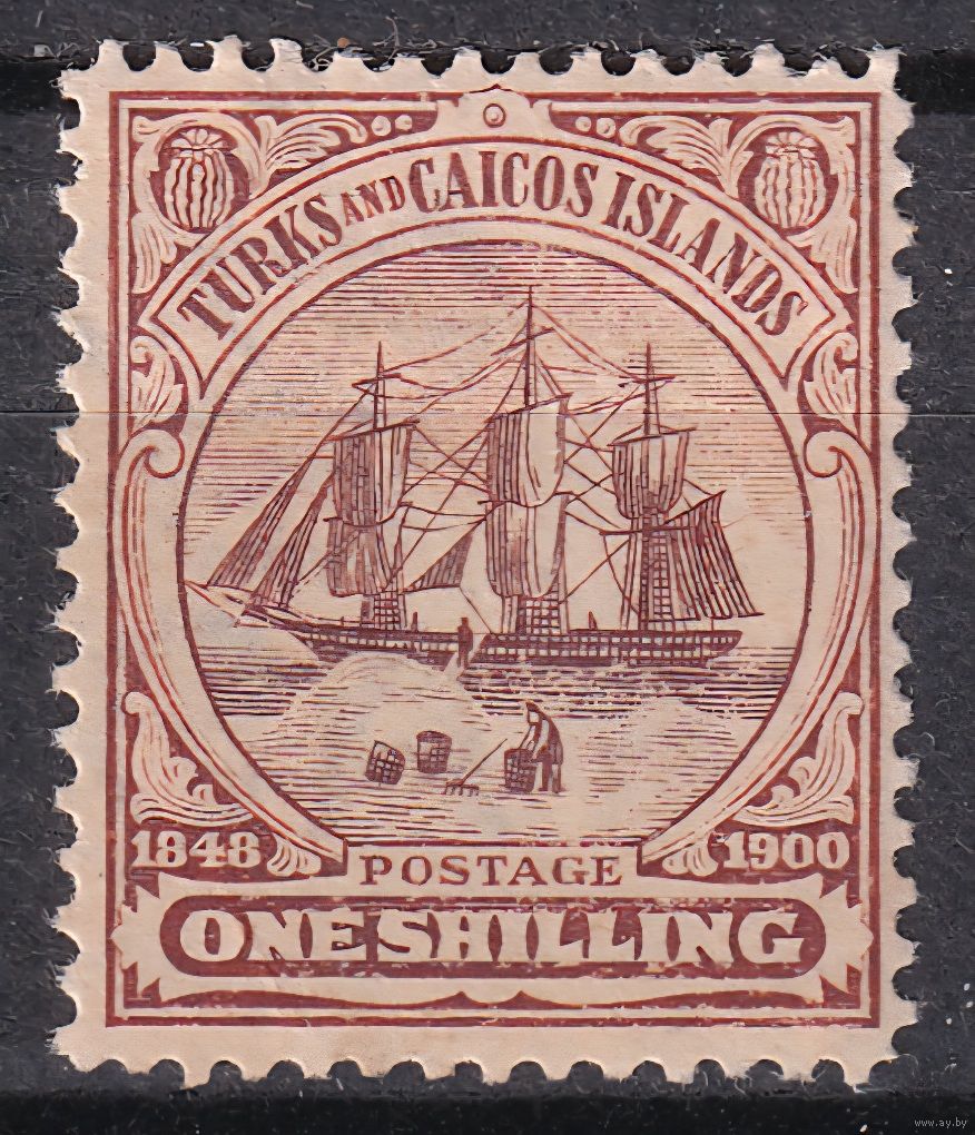 75.BrK. Великобритания. Колонии. Теркс и Кайкос. Парусник. Стандарт. 1 Sh. 1900 г. Mi.#40.