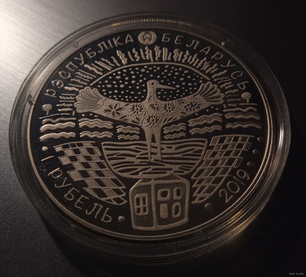 вверху – рельефное изображение Государственного герба Республики Беларусь; по кругу надписи: вверху – РЭСПУБЛІКА БЕЛАРУСЬ, внизу: слева – 1 РУБЕЛЬ (на медно-никелевой), справа − год чеканки; в центре – на фоне пейзажа стилизованное изображение аиста в гнезде на крыше дома.