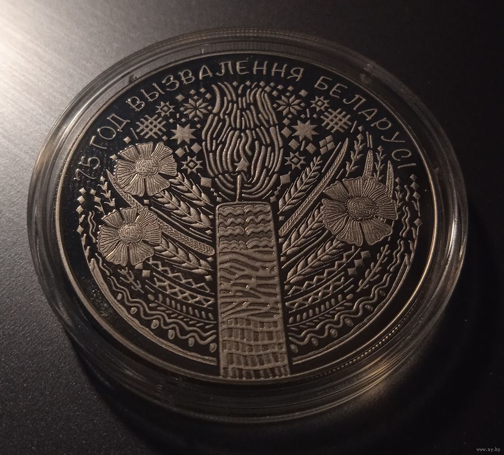 в центре – стилизованная композиция из свечи, цветов, колосьев и элементов национального орнамента, вверху по кругу надпись: 75 ГОД ВЫЗВАЛЕННЯ БЕЛАРУСІ.