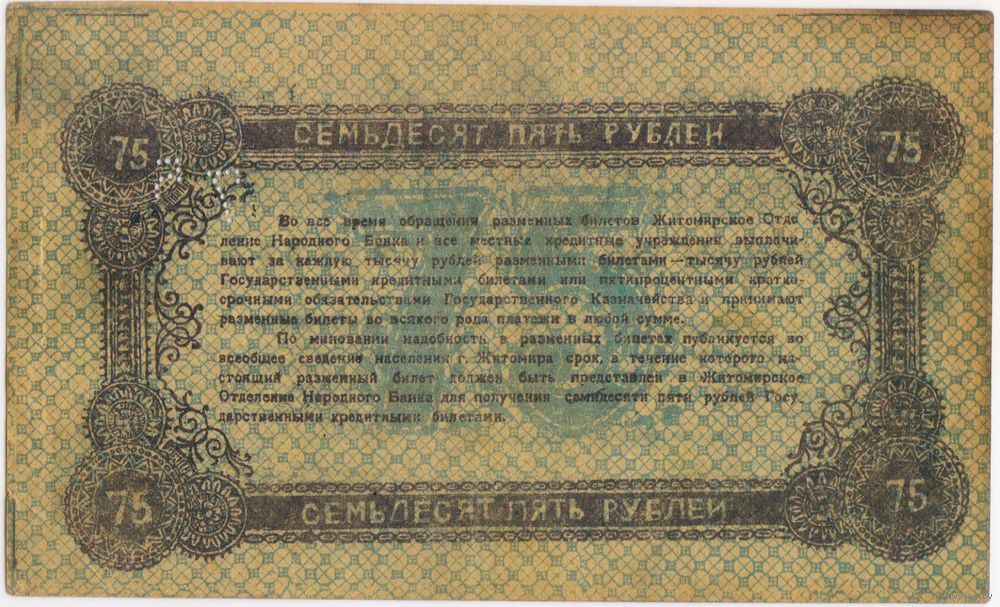 75 рублей 1919 г. (Житомир) Житомирское отделение Народного Банка (Серия А. Б.) Состояние EF.