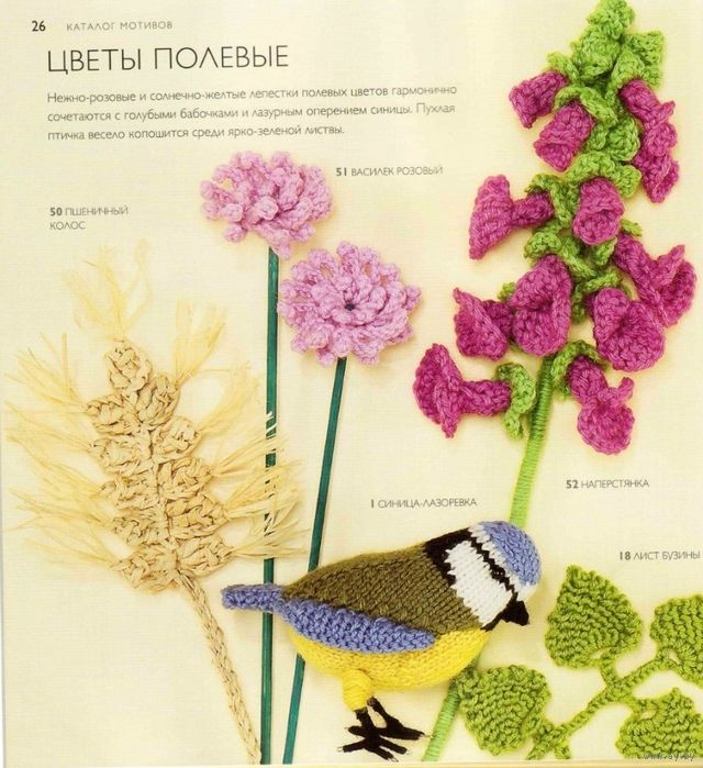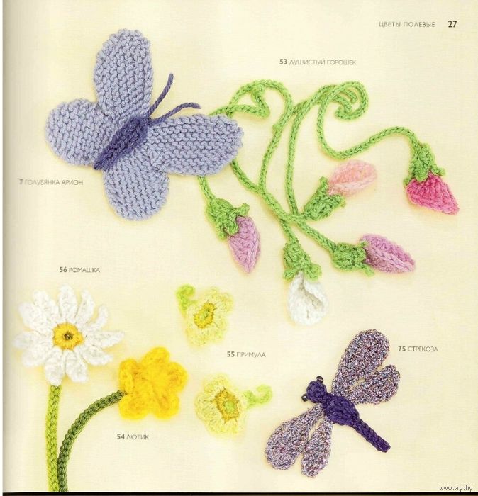 Расширьте свой репертуар вязаных мотивов, создавая миниатюрные шедевры: от рогатых улиток и пестрых гусениц до изысканных бабочек и сверкающих стрекоз из металлизированной пряжи. Эти симпатичные мелочи подойдут для украшения одежды, аксессуаров, для оформления обеденного стола и стен дома, а также сами по себе станут оригинальным подарком для родных и друзей.