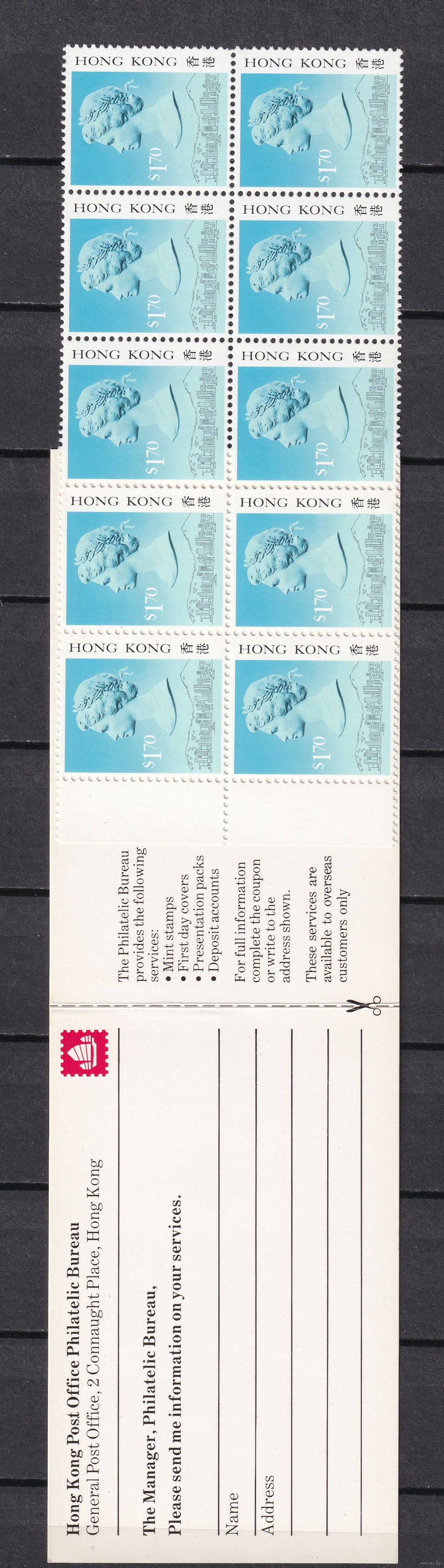 8.BrB. Великобритания. Колонии. Гонконг. Стандарт. Елезавета II. 1987 г. Буклет. 10 Х Mi.#516 I.