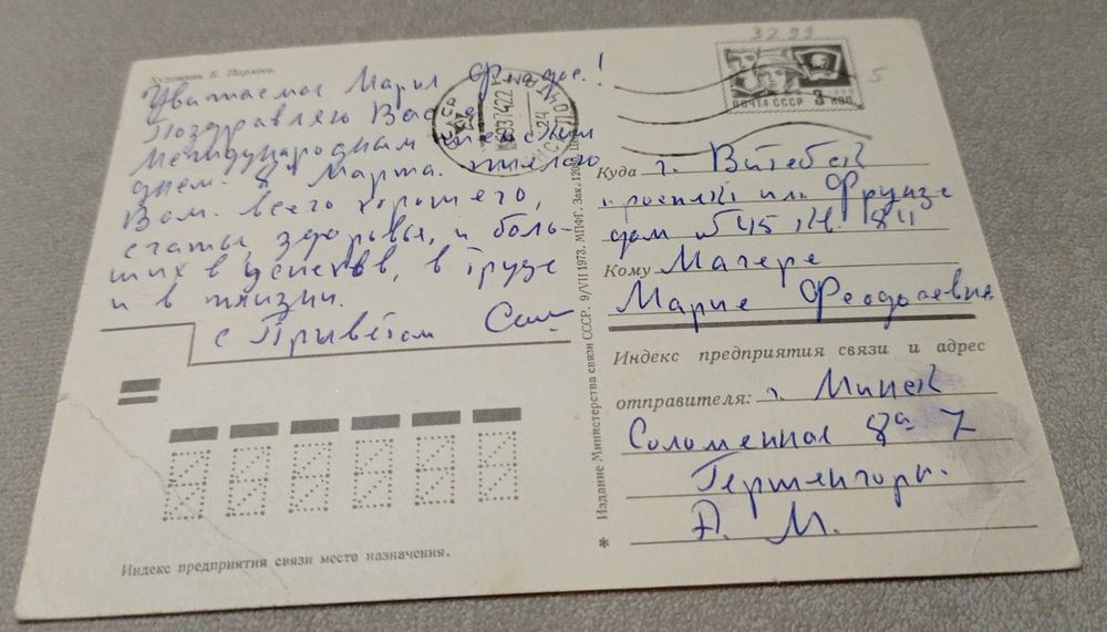 8 марта. Худ.Б.Пармеев, маркированная, прошла почту. Передача в Витебске при личной встрече возле ратуши. Пересылка в другой город за счёт покупателя по тарифам Белпочты либо Европочты после 100% предоплаты.