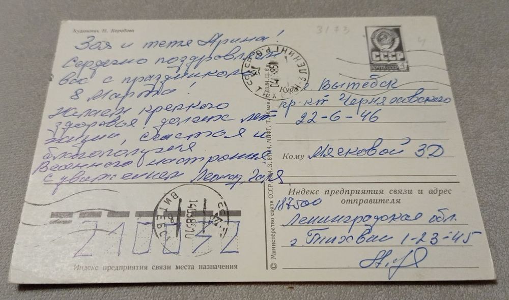 8 марта. Худ.Н.Коробова, маркированная, прошла почту. Передача в Витебске при личной встрече возле ратуши. Пересылка в другой город за счёт покупателя по тарифам Белпочты либо Европочты после 100% предоплаты.