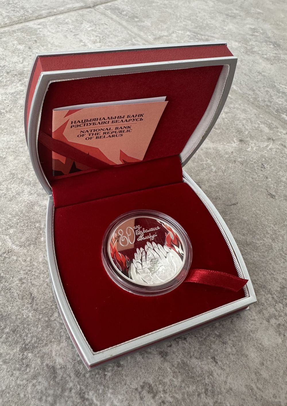 в центре – на ладонях в обрамлении языков пламени стилизованное изображение карты Республики Беларусь, вверху надпись – 80 ГОД ВЫЗВАЛЕННЯ БЕЛАРУСІ.