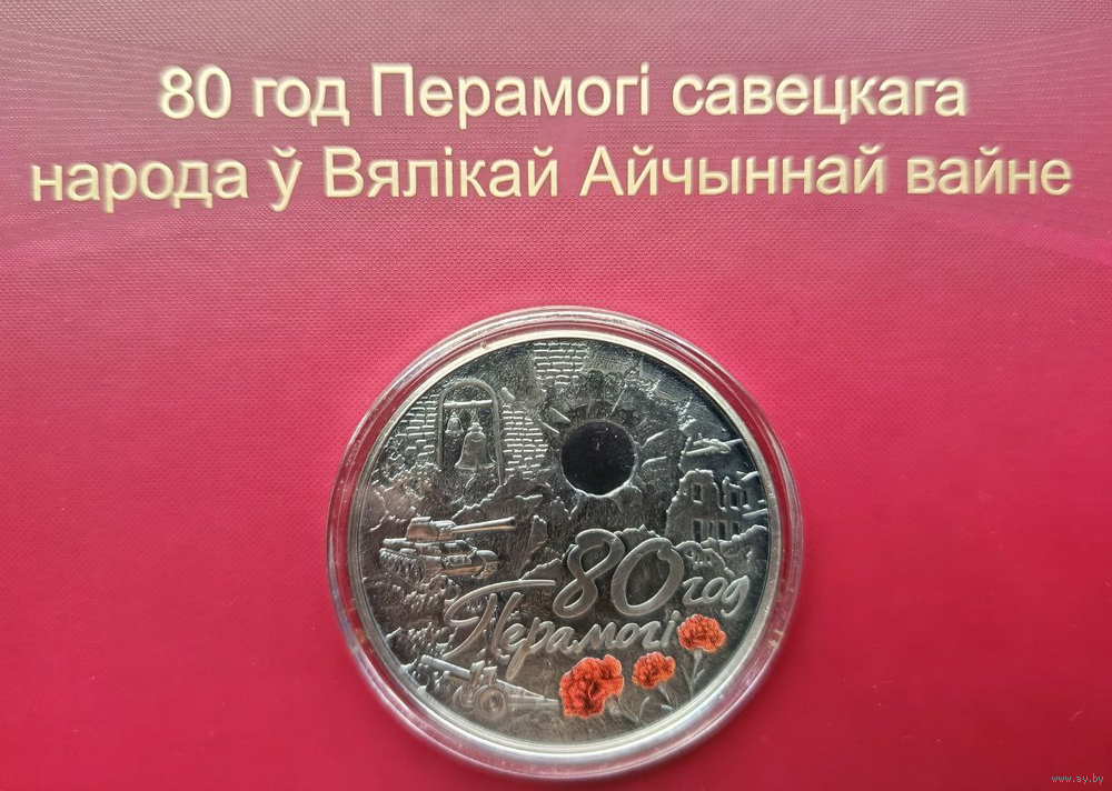 В центре – стилизованные изображения пулевого отверстия, колоколов, образцов военной техники и вооружения на фоне руин и надпись ”80 год Перамогі“. Внизу – стилизованное изображение трех гвоздик красного цвета.