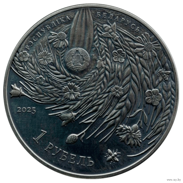 По кругу вверху – надпись: РЭСПУБЛІКА БЕЛАРУСЬ; в центре – рельефное изображение Государственного герба Республики Беларусь на фоне колосьев, цветов и неба; внизу – номинал 1 РУБЕЛЬ слева – проба сплава и год чеканки.