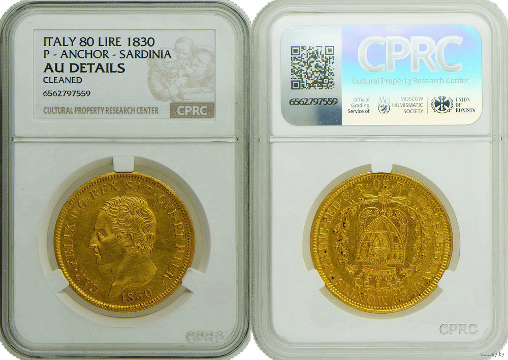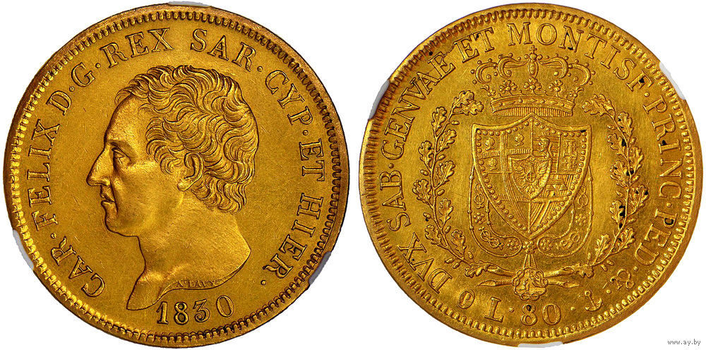 80 лир 1830 г. Карл Феликс. Сардинское королевство (1816 - 1868). Италия. CPRС AU det. Золото. Редкая монета в отличном коллекционном состоянии. Краузе #123.