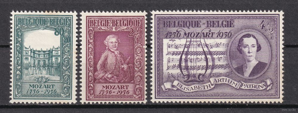 85.Bg. Бельгия. 200 лет со дня рождения Моцарта. 1955 г. Полная серия. Mi.##1036 -1038(* Состояние хорошее. Клей, наклейки или следы от наклейки).